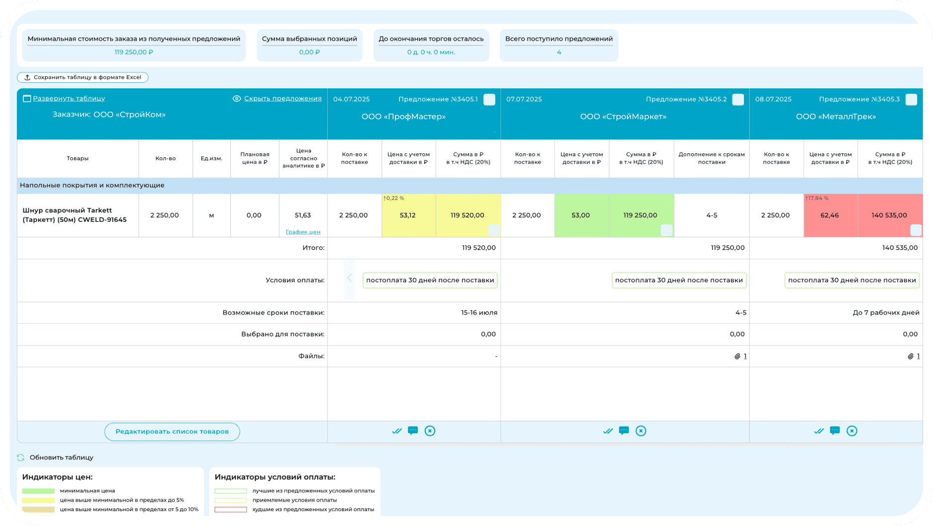 После публикации тендера ожидайте коммерческие предложения от Поставщиков (Подрядчиков) и заключайте сделки.